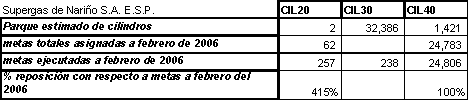 La metas totales asignadas a la sociedad SUPERGAS DE NARIÑO S.A. E.S.P. a febrero del 2006 son 62 Cilindros de 20 libras y 24.783 cilindros de 40 libras de las cuales la empresa ha repuesto a febrero del 2006, 257 cilindros de 20 libras y 24.806 de 40 libras respectivamente. Lo anterior corresponde al 415% de reposición de cilindros de 20 libras y al 100% de reposición de cilindros de 40 libras a febrero del 2006.