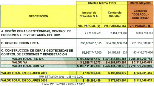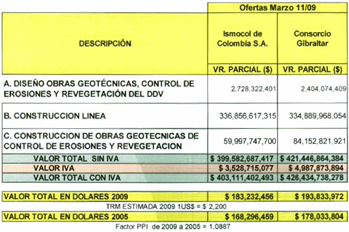 3.17. De acuerdo con el cuadro anterior, las gestiones hechas con los contratistas internacionales, dieron resultado, con una oferta que permitió disminuir en cerca de US$ 60 millones de 2005 la oferta original; es importante anotar que la mayoría de las firmas provenientes de Venezuela, fueron afectadas por las recientes medidas de expropiación del Gobierno Venezolano al sector petrolero, lo cual les impidió presentar una propuesta, en la medida en que no conocían con qué infraestructura contaban.