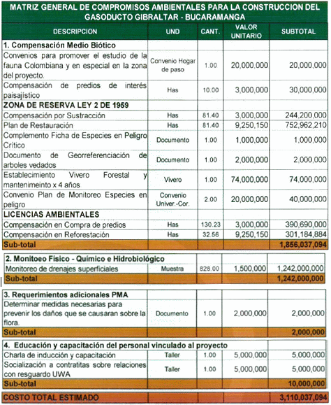 En ese sentido, tal y como se desprende del Anexo A del presente documento, la cotización presentada por ISMOCOL, reunía no solamente una condición de seriedad que le da el hecho de ser una de las principales empresas de construcción del país, sino adicionalmente, era la empresa con la cual TRANSORIENTE había concluido de manera exitosa el contrato para la construcción del gasoducto Barrancabermeja – Payoa. El contenido de la cotización hecha por Ismocol, se resume en el siguiente cuadro: