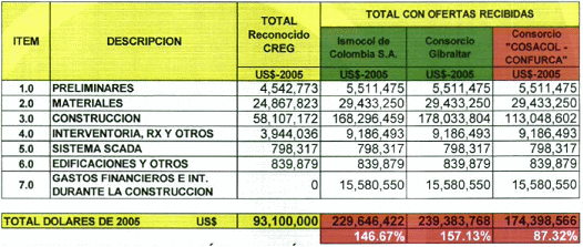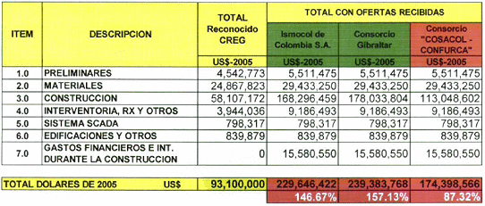Así, tal y como se puede concluir de los anexos a la presente solicitud, se busca en principio que el regulador involucre los costos derivados de la invitación abierta, o aquellos que la empresa logre conseguir, que sean inferiores a los mismos; en cualquier caso, esos valores son sustancialmente mayores a aquellos aprobados por la Comisión de Regulación de Energía y Gas originalmente.