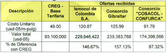 Derivado de esa segunda convocatoria, TRANSORIENTE recibió dos propuestas en valores que rondaban aproximadamente los USD 160 millones, es decir, alrededor de tres veces el presupuesto aprobado por la Comisión de Regulación de Energía y Gas.