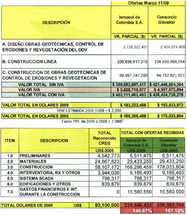 3.11. Al momento de comparar los valores utilizados por la Comisión de Regulación de Energía y Gas para la definición de la tarifa, con aquellos que efectivamente se lograron con la apertura de la convocatoria, difieren de forma importante, tal y como se establece en los siguientes cuadros: