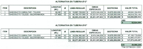Como puede resultar obvio, derivado de la presentación de esta solicitud, los valores estimados por la Comisión de Regulación de Energía y Gas resultaron muy inferiores a aquellos en los que efectivamente va a incurrir TRANSORIENTE en la construcción del gasoducto, tal y como se muestra en el presente documento.