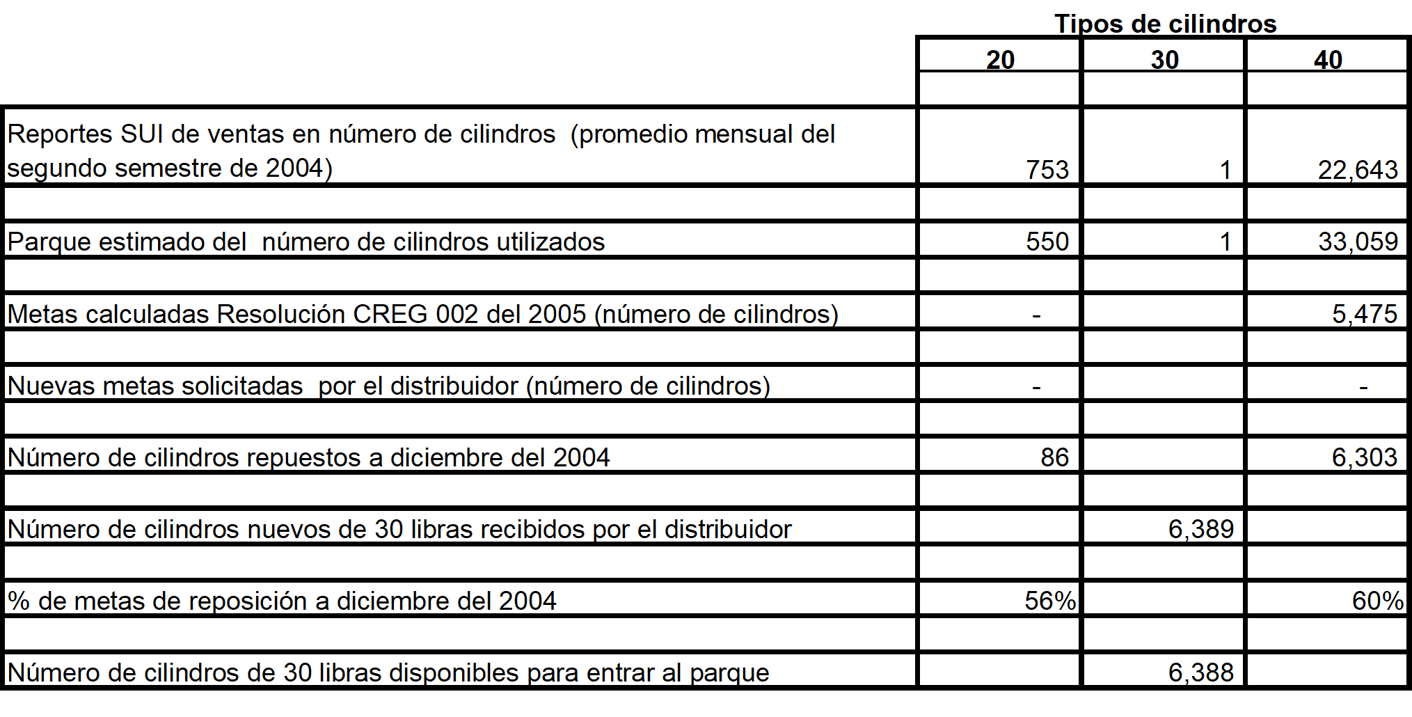 Es así que la programación de las metas que se encuentra contenida en la Resolución 002 de 2005 se realizó con base en la información de ventas reportadas al SUI por cada uno de los distribuidores durante el segundo semestre de 2004 y utilizando los criterios y metodología detallados en la Resolución. De lo anterior se observa que las metas tienen relación directa con el parque de cilindros que opera cada uno de los distribuidores. En la práctica se ha demostrado que el modelo de estimación de metas que ha utilizado la CREG para estimar las metas individuales es consistente y que las empresas pueden programar incluso metas superiores a las mínimas establecidas sin tener problemas operativos.