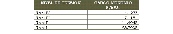 Artículo 1o. Cargos monomios. Los cargos monomios por uso del Sistema de Transmisión Regional y/o Distribución Local operado por las Empresas Públicas de Medellín, serán los siguientes, a pesos de diciembre de 1996:
