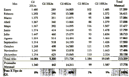 Para efectos de la programación de metas el número de cilindros que se debe reponer en el país se calcula con base en el número estimado de cilindros en circulación. El compromiso de reposición que se establece por cada empresa distribuidora es proporcional a su participación en el mercado y considera no solo el stock de cilindros que posee en la planta envasadora, sino todos los cilindros que emplea para atender a sus clientes en concordancia con el nivel total de ventas.