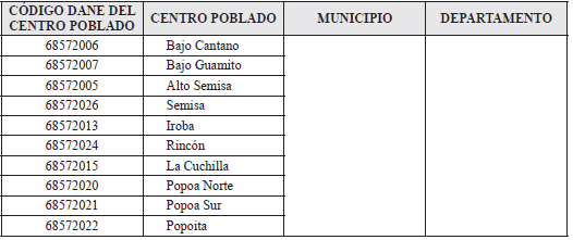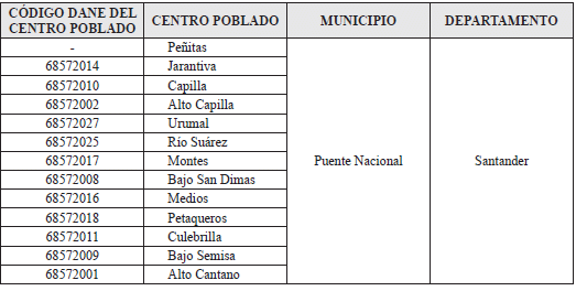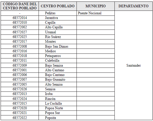 ARTÍCULO 1o. MERCADOS RELEVANTES DE DISTRIBUCIÓN PARA EL SIGUIENTE PERIODO TARIFARIO. Conforme a lo definido en el numeral 5.3 de la Resolución CREG 202 de 2013, el Mercado Relevante de Distribución para el Siguiente Periodo Tarifario corresponde a un Mercado Relevante Especial y estará conformado por los siguientes centros poblados:
