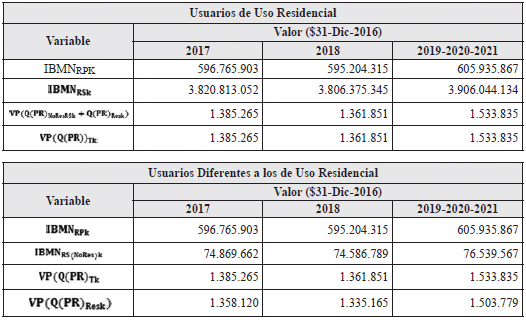 Aplicando la metodología contenida en la Resolución CREG 202 de 2013 y sus modificaciones y adiciones, se calcularon conforme a las fórmulas establecidas en los numerales 9.1.1.3 y 9.2.1.3 del artículo 9o para la componente que remunera la inversión base, aplicable a usuarios de uso residencial y a usuarios diferentes a los de uso residencial y se obtuvieron las siguientes variables principales: