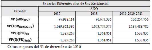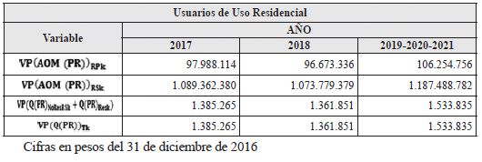 Aplicando la metodología contenida en la Resolución CREG 202 de 2013 y sus modificaciones y adiciones, se calcularon conforme a las fórmulas establecidas en los numerales 9.1.1.3 y 9.2.1.3 del artículo 9o para la componente que remunera los gastos de AOM, aplicable a usuarios de uso residencial y a usuarios diferentes a los de uso residencial, las siguientes variables principales: