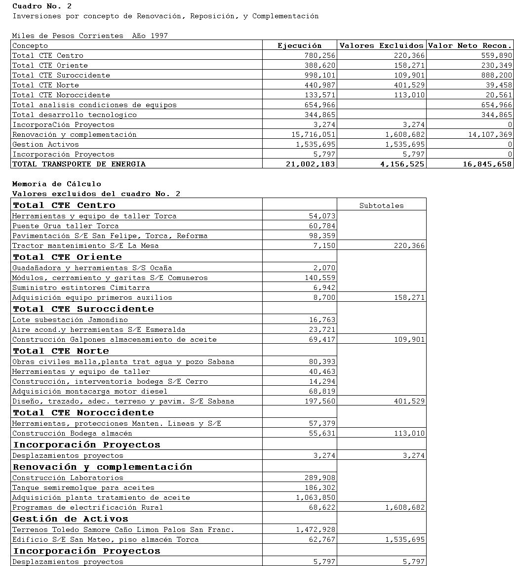 3.5. Al confrontar los valores globales por concepto de renovación, reposición y complementación que aparecen en la página 14 del recurso, con los reportados en la prueba No. 16 del mismo que contiene la relación de inversiones de ISA en reposición, renovación y complementación, asociadas al servicio de transmisión de energía, periodo 1998 – 1999, se encontró que la información estaba incompleta. Por este motivo se solicitó a ISA que completara la información correspondiente, dado que en el memorial de recurso que reposa en los archivos de la Comisión (Radicado CREG 1138 de febrero 17 de 2000) no se encontró la información del año 1997, ni los cuadros con la información relacionada con lo que ISA denomina Centros de Transmisión de Energía. En cumplimiento del decreto de pruebas adicionales (Radicado CREG 5311 del 10 de julio de 2000) se obtuvo la adición a la prueba 16 del recurso. Llama la atención que en la carta de respuesta con la cual se adiciona la información, se sugiera que esta venía completa en el recurso original, circunstancia que no es cierta y que se opone a la actitud diligente de la CREG al proveer una oportunidad más para que la impugnante sustente sus pretensiones.