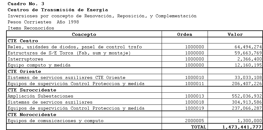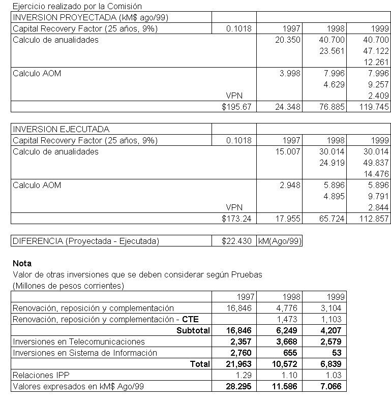 […]Recomendamos a la CREG, que revise en detalle los montos de las inversiones y sus respectivos conceptos (SAP, Telecomunicaciones, etc.) presentados por ISA, que según ellos no fueron tenidos en los cálculos de la Resolución 095 de 1999; lo anterior con el fin de que se verifique que algunos de los mencionados conceptos no hayan sido remunerados en el AOM reconocido, y que los restantes sean remunerados en su totalidad o en la parte que les corresponda, a través de los Cargos por Uso del Sistema de Transmisión Nacional."