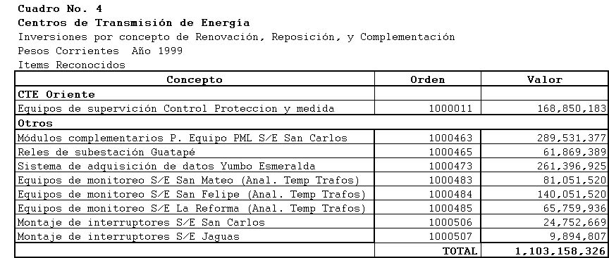 3.9. Siguiendo la metodología de cálculo utilizada para la expedición de la Resolución CREG-095 de 1999, los valores adicionales reconocidos por inversiones ejecutadas asociadas al servicio de transporte en el STN, expresados en millones de pesos de agosto de 1999, fueron los siguientes: