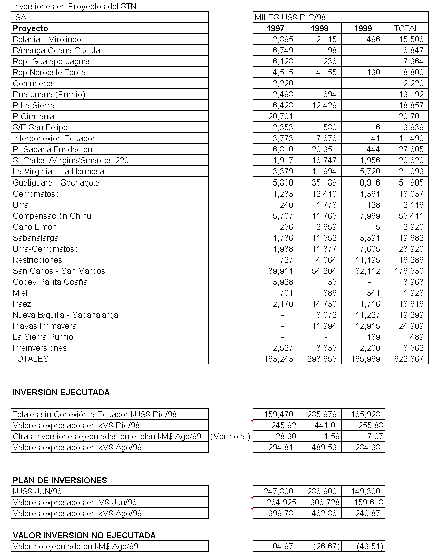 En la Tabla No.1 del documento que la UPME remitió a la Comisión, denominada, "Programa de Inversiones en el STN en el periodo 1997 al 2002", la información reportada por ISA corresponde al valor total de las inversiones reportadas por ISA a la FEN que incluyen: