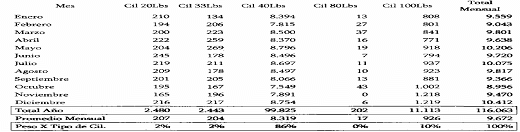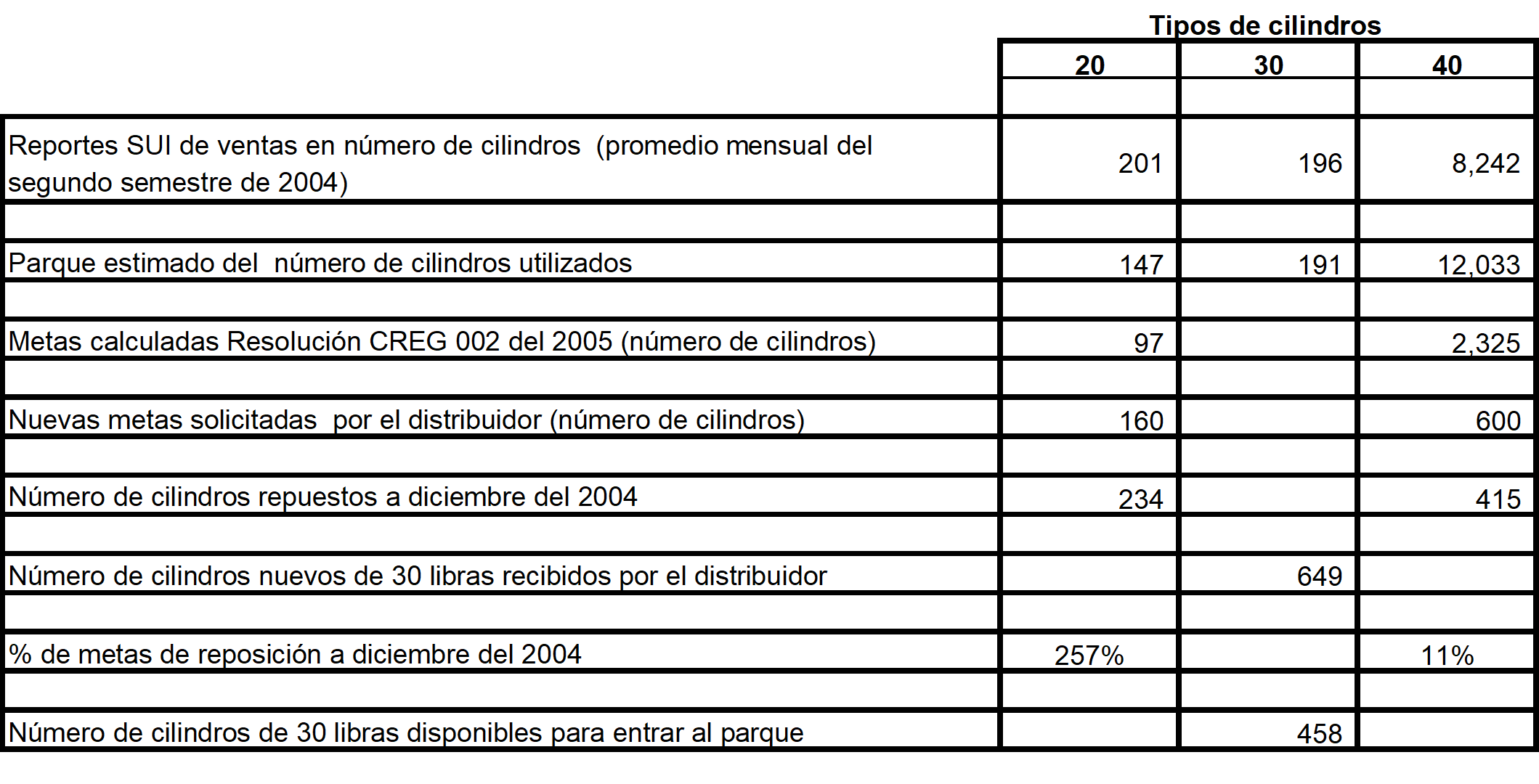 “El inventario total de la planta de cilindros de 20 y 40 libras es de 756 frente a 606 que es en promedio la cuota de reposición trimestral, lo que deja ver que la cuota de reposición según la resolución para los cilindros de 20 lbs es cumplible ya que es una cuota razonable frente a nuestros inventarios y niveles de ventas, pero la meta de 40 lbs sigue siendo muy elevada, pues significaría un recambio de más del 207% del inventario de la planta para tan solo un año, lo que afectaría dramáticamente financieramente a la compañía y peor aun los 756 cilindros de inventario de la planta frente a los 2.422 cilindros que suman las cuotas de los 4 períodos programados por la CREG como resultado para reponer arroja más del 220% más de lo que la planta tiene en inventario para sus vehículos. Tarea que como usted puede observar y de acuerdo a lo expuesto nos es imposible de cumplir las metas propuestas en cuanto a los cilindros de 40 libras.