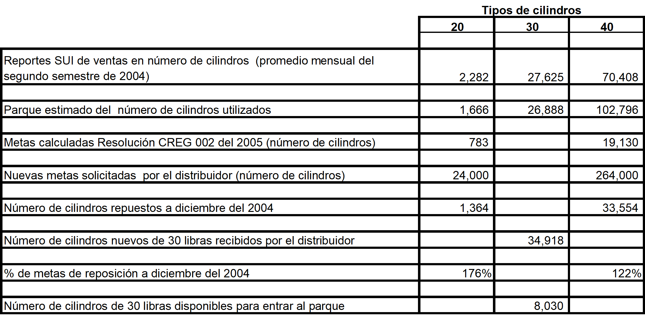 En la medida en que actualmente existe un programa de reposición que tiene como objetivo asegurar el cambio gradual del parque de cilindros del país, el cual ha sido ampliamente sustentado, la CREG ha establecido una obligación o meta mínima de reposición que deben cumplir las empresas. La participación de todas las empresas distribuidoras de GLP es requisito indispensable y por tanto las metas no pretenden premiar o castigar a los distribuidores, sólo pretenden hacer efectivo el programa de reposición. Este programa es gradual dada la disponibilidad de recursos del margen de seguridad y por lo tanto los distribuidores deben determinar qué cilindros se deben programar prioritariamente y cumplir con las metas que les corresponden en el mercado que atienden.