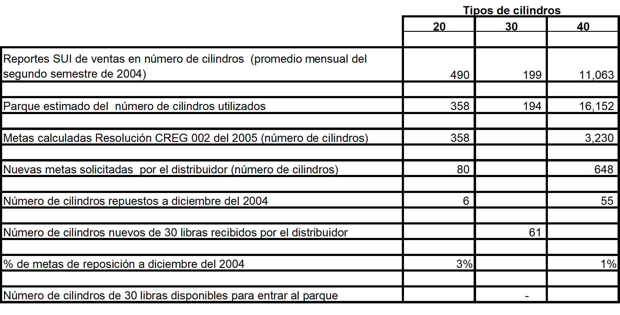 “Como oportunamente se le expuso a la Superintendencia de Servicios Públicos y a la CREG en informe SUI radicado con fecha junio 7 de 2004, la empresa cuenta con un inventario de 137 cilindros de 20 libras y 1890 de 40 libras, al cual solicito que esa entidad se remita para su constatación. Al realizar el correspondiente cálculo, se está imponiendo a la empresa reponer en un trimestre el 65.68% deI parque de cilindros de 20 libras, y el 42,75% de los cilindros de 40 libras. Al realizar un sondeo entre el público, se ha obtenido que el 67% de los clientes se niegan rotundamente a cambiar su cilindro, frente a un 10% que definitivamente acepta el cambio de tamaño sin obstáculo. Luego, se está determinando una carga a la empresa que de antemano no podrá cumplir por el hecho exógeno de no depender de ella el cambio ordenado.