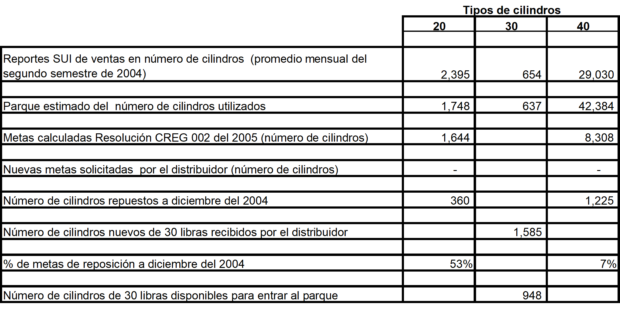 - Se estableció una meta mínima específica por empresa para la reposición de cilindros de 20 y 40 libras. Los cilindros de 20 libras que quedan en el parque requerido para atender la demanda actual serán repuestos en su totalidad con el fin de eliminar un tamaño del mercado, facilitando así las labores de control. Los cilindros restantes de 40 libras necesarios para atender la demanda actual serán repuestos en los próximos años.