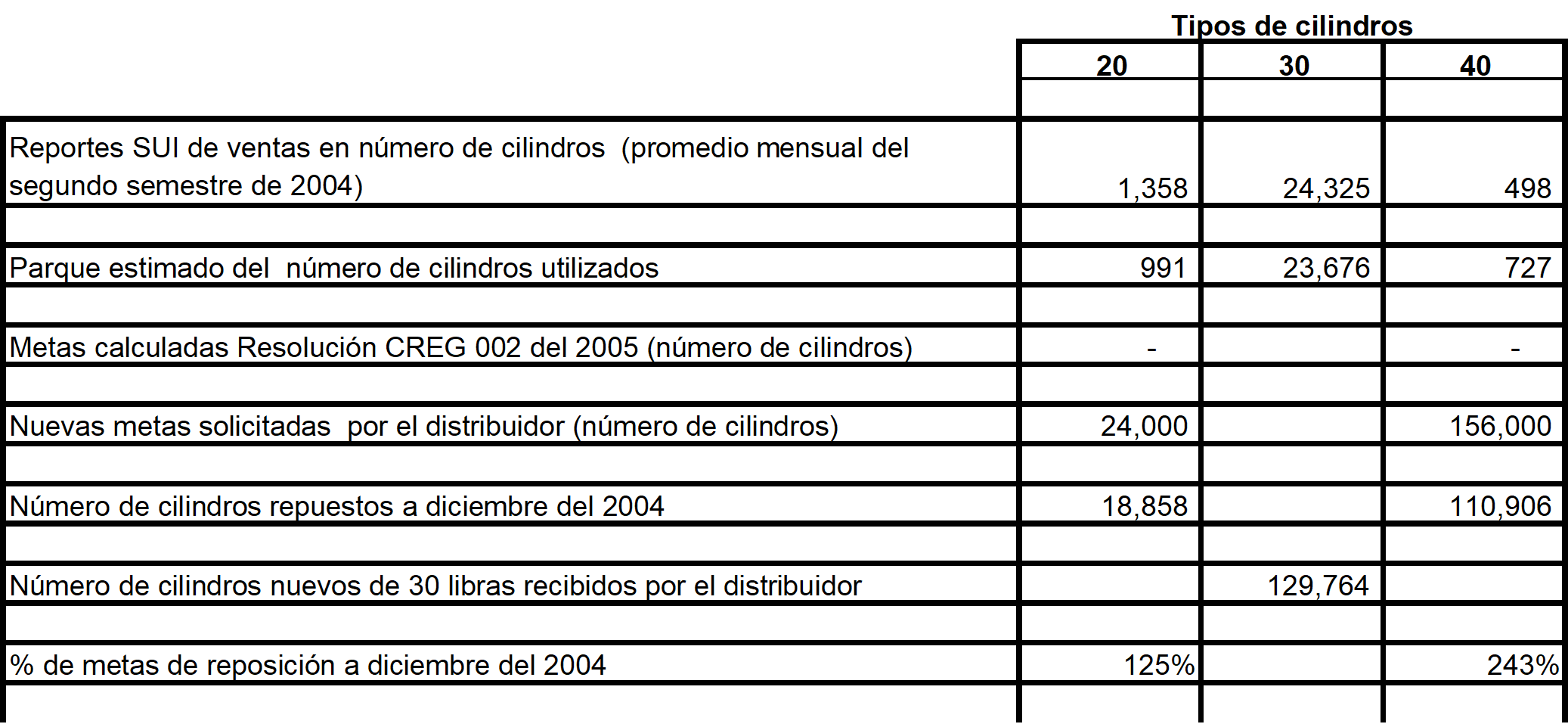 De otra parte para definir las metas individuales de reposición aplicables al año 2005, contenidas en la Resolución CREG 002 de 2005, se estimó el tamaño del parque de cilindros en circulación para atender la demanda actual del Servicio Público Domiciliario de GLP. Esto se realizó con base en la información de ventas reportadas al SUI por cada uno de los distribuidores durante el segundo semestre de 2004 y utilizando los criterios detallados en el documento 007 del 24 de febrero de 2005 soporte de la Resolución 002 objeto de recurso.