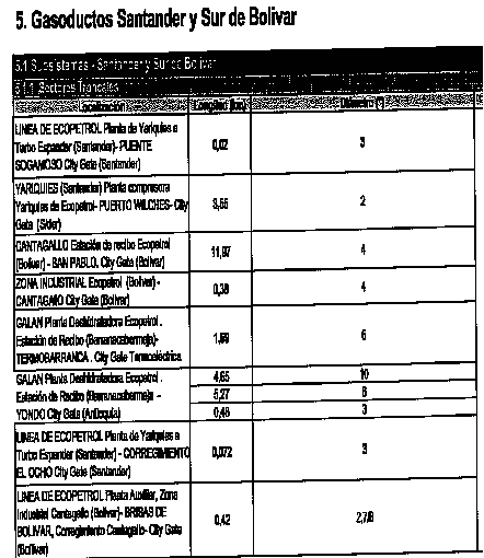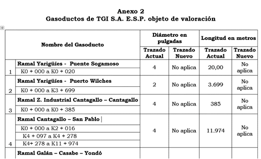 “Contrato de Enajenación de los Activos, Cesión de los Derechos y Contratos de ECOGAS, Anexo 10.3, Tomo 4. En este documento se puede evidenciar que el activo entregado por ECOGAS a TGI tiene un diámetro de 4" como ha sido siempre informado por TGI a la Comisión. A continuación se presenta la imagen de la Tabla del Anexo citado, numeral 5 "Gasoductos Santander y Sur de Bolívar", pág. 22, tomo 4.”