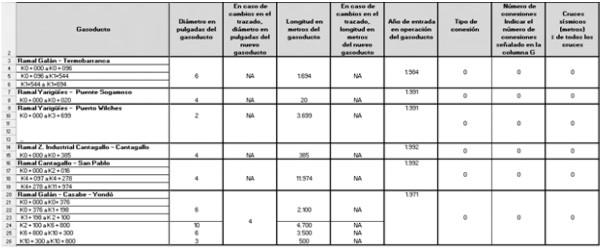 11. Como antecedente se puede citar el caso del gasoducto Gibraltar - Bucaramanga donde inicialmente, en la Resolución CREG 044 de 2007, se registró un diámetro de 10 pulgadas y 190 kilómetros. Estos datos fueron reportados por el transportador como información proyectada para la construcción del gasoducto. Una vez se construyó el gasoducto el transportador informó que la longitud y el diámetro real del gasoducto fue de 177,15 km y 12 pulgadas. Estos nuevos valores se incluyeron en la Resolución CREG 045 de 2014.