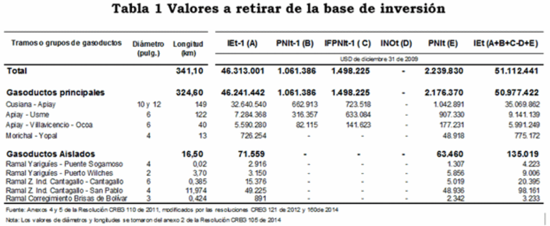 2.2.2.5 Tabla de valores a retirar de la resolución CREG 261 de 2016