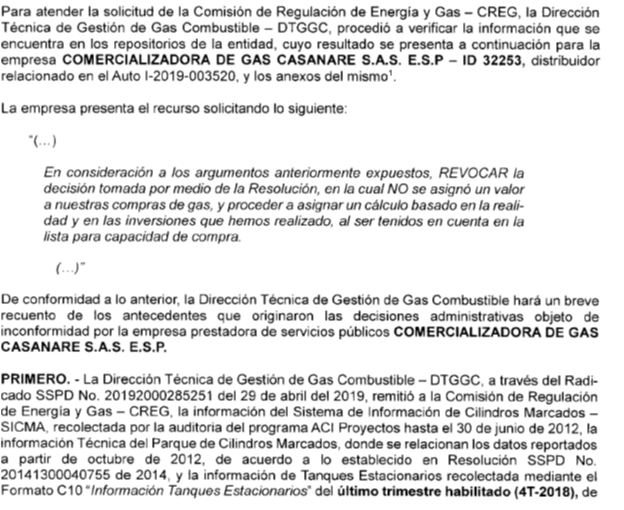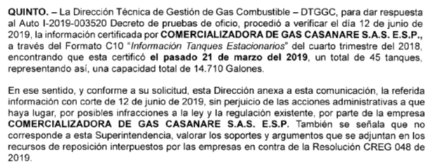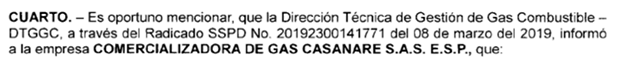 En respuesta al auto de pruebas mediante comunicación 20192300451871 radicado CREG E-2019-006586, la Superintendencia de Servicios Públicos Domiciliarios expuso lo siguiente para el caso de la empresa Comercializadora de Gas Casanare: