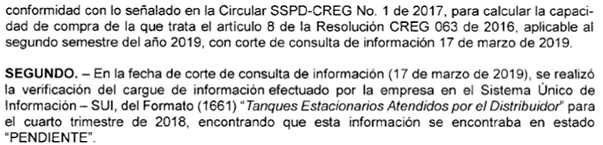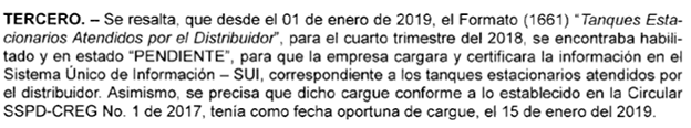 Cabe precisar que, a la fecha de consulta de información, las siguientes empresas no habían cargado y certificado en el SUI la información del Formato (1661) Tanques Estacionarios Atendidos por el Distribuidor, para el cuarto trimestre del 2018, la cual tenía corno fecha máxima de reporte el 15 de enero de 2019. Sin embargo, es necesario mencionar que dicho Formato se encuentra habilitado y en estado "PENDIENTE", para que las empresas cargaran y certificaran la información hasta antes de la fecha de corte que aquí se relaciona.