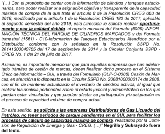 Por otra parte, con el propósito de contar con la información de cilindros y tanques estacionarios, para poder realizar una asignación objetiva y transparente de la capacidad máxima de compra de la que trata el artículo 8 de la Resolución CREG 063 de 2016, modificado por el artículo 1 de la Resolución CREG 180 de 2017, aplicable al segundo semestre del año 2019, esta Dirección el pasado 08 de marzo de 2019, solicitó a todos los Distribuidores Inversionistas de Gas Licuado del Petróleo, realizar oportunamente y con la calidad debida, el reporte mensual del Formato (6009) INFORMACIÓN TÉCNICA DEL PARQUE DE CILINDROS MARCADOS y del Formato trimestral (1661) – C10- INFORMACIÓN DE TANQUES ESTACIONARIOS ATENDIDOS POR EL DISTRIBUIDOR, conforme con lo señalado en la Resolución SSPD No. 20141300040755 del 17 de septiembre de 2014 y la Circular Conjunta SSPD - CREG No. 1 del 21 de julio de 2017. (…)”