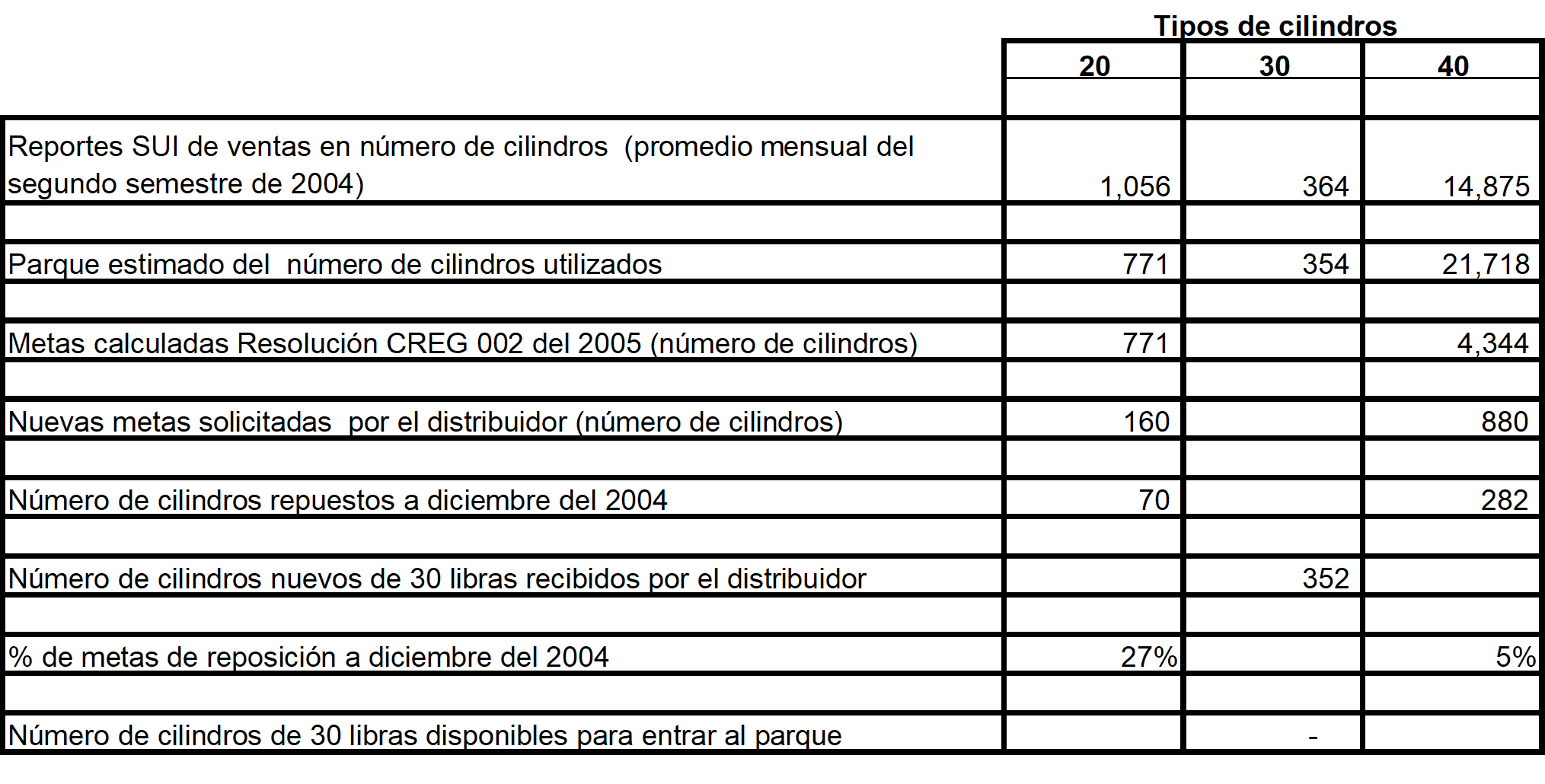 “Como oportunamente se le expuso a la Superintendencia de Servicios Públicos y a la CREG en informe SUI radicado con fecha junio 7 de 2004, la empresa cuenta con un inventario de 250 cilindros de 20 libras, 60 de 30 libras y 2.628 de 40 libras, al cual solicito que esa entidad se remita para su constatación. Al realizar el correspondiente cálculo, se está imponiendo a la empresa reponer en un trimestre el 77.5.% deI parque de cilindros de 20 libras, y el 41% de 40 libras, lo cual significa que en los dos primeros trimestres coparía íntegramente el parque de cilindros, porque significaría una reposición del 1554%, por encima del tope de cilindros con que cuenta la empresa y al tercer trimestre, del 123% respecto de los cilindros de 40 libras, con el agravante que como se dijo, el usuario se niega a recibir cilindros de 30 libras a cambio de sus cilindros, de 40 libras, que es donde precisamente se presenta el mayor obstáculo en la tarea de reposición. De manera que el cambio de tamaño debe hacerse gradual.”