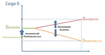 La metodología tarifaria propuesta permite la discriminación de precios entre el mercado residencial (cuya demanda es inelástica) y el no residencial (demanda elástica), buscando mitigar la declinación de la demanda no residencial, de manera que la mayor demanda total permita abaratar el costo promedio de prestación del servicio. Estos menores costos a su vez deben redundar en menores tarifas para ambos mercados, el residencial y el no residencial, garantizando la suficiencia financiera en la remuneración al distribuidor.