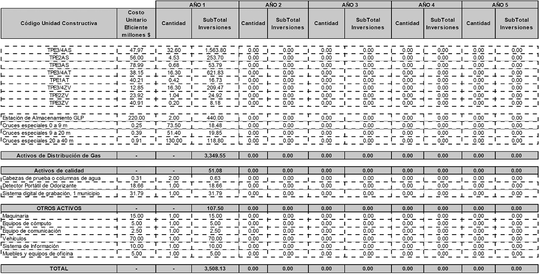 En la mencionada comunicación se allegaron las proyecciones de demanda, las proyecciones de gastos de AOM de distribución y el programa de nuevas inversiones, clasificadas según el listado de unidades constructivas establecido en el Anexo número 1 de la Resolución CREG 011 de 2003.