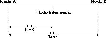 Sea el tramo de interés el que conecta los nodos A y B y que tiene una longitud total de LT(km) para el cual se calcularán los cargos de salida en el nodo intermedio I ubicado a una distancia LI(km), medida sobre la troncal desde el nodo A.