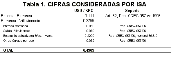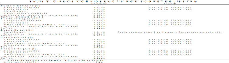 | Otros cargos por uso /tramo Barranca-V/cencio | N | 0.0320 | Numeral 56.5 resolución CREG 057 de 1996. |