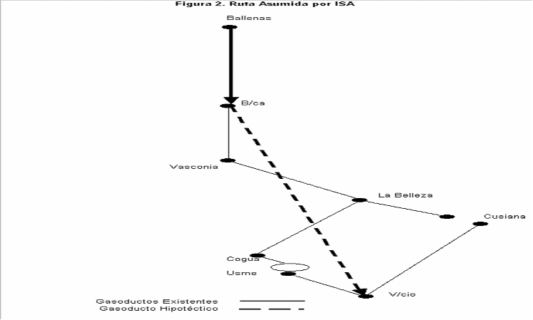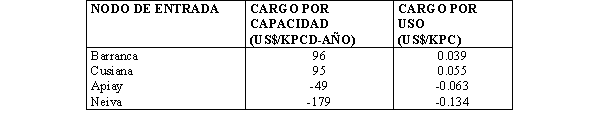 Se seleccionó un esquema de cargos por entrada y salida que toma como referencia un centro hipotético de gravedad de la carga del sistema, el cual se considera localizado en el sitio de Vasconia (donde se espera que en el mediano plazo se encuentren los flujos de gas provenientes de los yacimientos del Magdalena Medio y del Piedemonte Llanero).