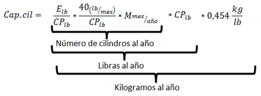 | Capacidad de envase en cilindros, de acuerdo con la información registrada desde el 2008 hasta octubre de 2012, por AIC proyectos, para cada marca de propiedad del distribuidor i, en el periodo t, medida en kilogramos, definido de la siguiente forma: |