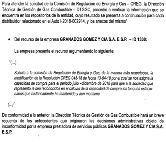 Granados Gómez como distribuidor y comercializador minorista de GLP, solicita que sea reevaluada y puesto a consideración la capacidad de compra notificada mediante resolución CREG 048 de 2018 emitida por la CREG donde se asigna solamente 1.457.200 UN MILLON CUATROSCIENTOS CINCUENTA Y SIETE MUL DOSCIENTOS KILOS, para el período julio – diciembre de 2018 haciendo falta para Granel.