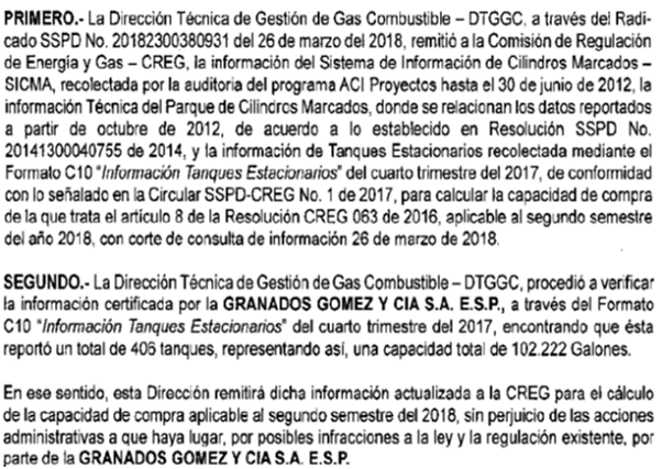 En respuesta al auto de pruebas la Superintendencia de Servicios Públicos Domiciliarios expuso lo siguiente parta el caso de la empresa Granados Gómez de Colombia: