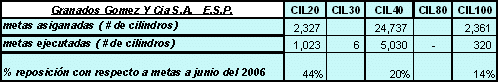 Al respecto es necesario reiterar que la programación de metas individuales de reposición de cilindros se realizó con base en la metodología utilizada en la Resolución CREG 009 de 2006. De igual forma se tuvo en cuenta la información reportada al SUI por cada uno de los distribuidores, correspondiente a sus ventas en cilindros durante el segundo semestre de 2006 para cada uno de los tamaños de cilindros, es decir, 20, 33, 40, 77 y 100 libras.