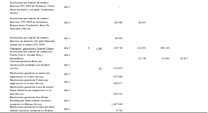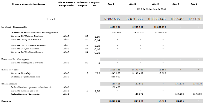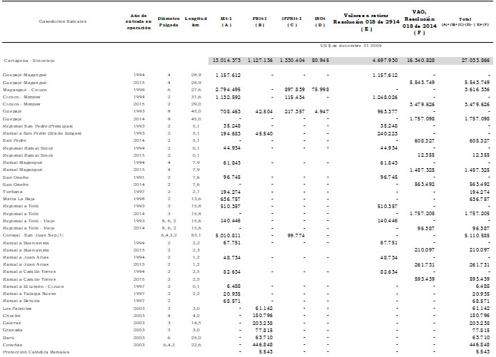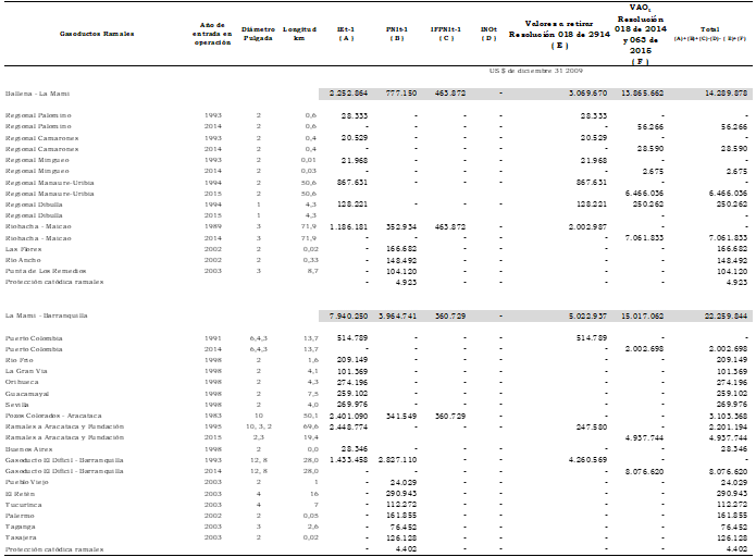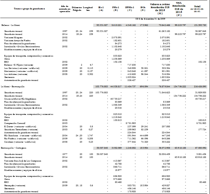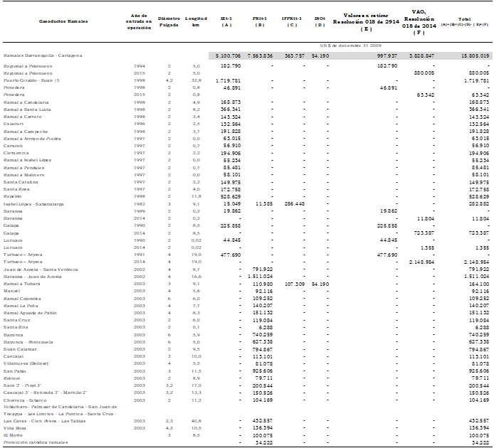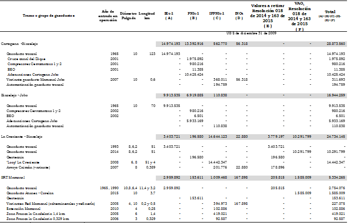 Artículo 3o. Inversión existente. Como inversión existente, IEt, se reconocen US$490.786.992 (dólares de diciembre 31 de 2009) para los gasoductos principales y US$114.819.413 (dólares de diciembre 31 de 2009) para los gasoductos ramales de acuerdo con la desagregación presentada en el Anexo 1 de esta resolución.