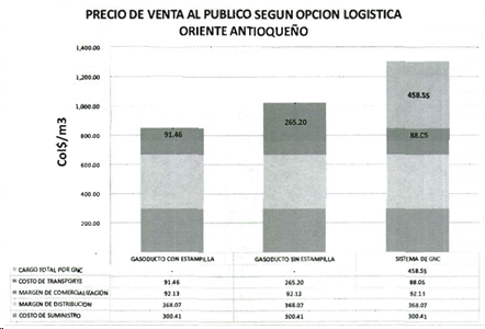 Al mismo tiempo, es claro que la estampilla del gasoducto, permitiría al tiempo un beneficio en la tarifa al usuario final en el mercado del Oriente Antioqueño, que de no hacerse, le implicaría pagar una tarifa un 200% más alta, sin que exista realmente una justificación respecto de ese incremento. Esta cifra se revela en la siguiente tabla: