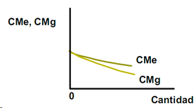 En los procesos de producción en los que hay rendimientos crecientes de escala la curva de los costos marginales (CMg) está por debajo de la de los costos medios (CMe), tal como se indica en la siguiente gráfica: