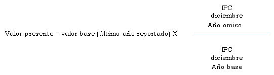Para la EMPRESA DE SERVICIOS PÚBLICOS MUNICIPALES PERLA DEL MANACACÍAS E.S.P., en los años que no reportó información de los estados financieros, se tomó como base de liquidación, el último reportado y se actualizó a valor presente utilizando la siguiente fórmula: