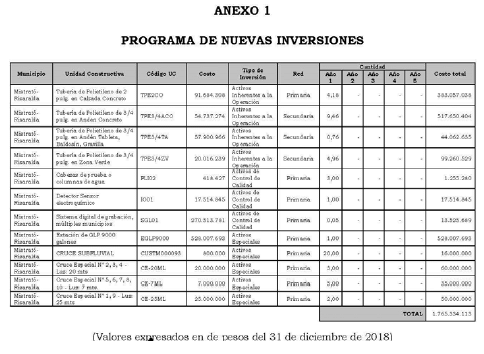 3.1. Programa de Nuevas Inversiones para Municipios Nuevos (INPI). El Programa de Nuevas Inversiones corresponde a un valor de $1.765.334.113 ($ del 31 de diciembre de 2018), y su descripción se presenta en el Anexo 1 de la presente Resolución.