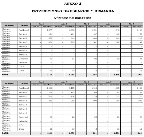 ARTÍCULO 2o. DEMANDAS DE VOLUMEN. Para el cálculo tarifario se utilizó la Demanda de Volumen para el horizonte de proyección presentada en el Anexo 2 de esta Resolución.