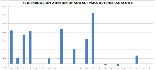 En el Gráfico 4 se exhiben los resultados de la depuración que fue posible hacer por parte de la Comisión, los cuales muestran la importancia de este ejercicio adicional utilizando las cuentas auxiliares del SUI: en él se observa el porcentaje de ajuste adicional a los gastos de AOM depurados por las empresas.