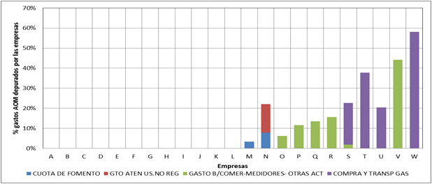 En las empresas M y N se evidenció la inclusión de impuestos de la actividad de transporte de gas (i.e., cuota de fomento). Las empresas O, P, Q, R y S incluyeron el costo por bienes y servicios comercializados (e.g., medidores, visitas técnicas, otros no relacionados a las actividades de D&C) dentro de los gastos mencionados.