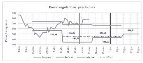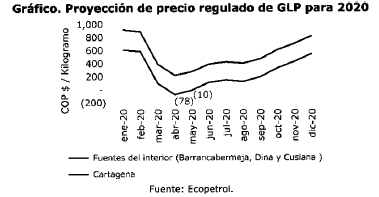 La gráfica que se presenta a continuación muestra la aplicación del precio y su proyección al mes de junio. De acuerdo con esto, de no haber contado con dicho precio piso, como resultado de la volatilidad de los precios internacionales del crudo y la volatilidad de la Tasa Representativa del Mercado TRM, el precio regulado hubiese estado en precios históricos cercanos a $340 por kg, lo cual hubiese abierto la posibilidad de que Ecopetrol encontrara un uso más eficiente al GLP, o la destinación a otra actividad y, por ende, no ser ofrecido al servicio público domiciliario: