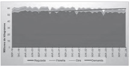 En relación con esto, en la gráfica que se presenta a continuación, se establece el Potencial de Producción de GLP, diferenciando entre: i) las fuentes sujetas a libertad regulada, que corresponden a aquellas comercializadas por Ecopetrol; ii) la producción denominada Floreña, fuente de producción que, hasta febrero de 2020, fue declarada como fuente de precio libre por un comercializador mayorista, TYGas, pero que, a partir de dicha fecha, es declarada por Ecopetrol; iii) y las declaraciones de los demás productores. Teniendo en cuenta que la demanda de GLP en el país oscila alrededor de los 52 millones de kilogramos al mes, para atender 4,5 millones de usuarios, según información reportada por los distribuidores al Sistema Único de Información (SUI), se hace una proyección de crecimiento anual y constante del 3%, a efectos de señalar el posible nivel de producto requerido para su atención.