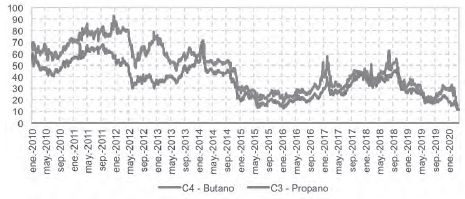 Gráfica Precios internacionales de propano y butano 2010 - 2020