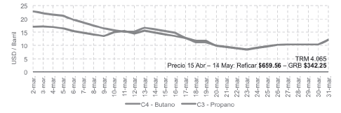 En la siguiente gráfica se presenta el comportamiento de los precios internacionales del GLP, propano y butano, para el mes de marzo de 2020: